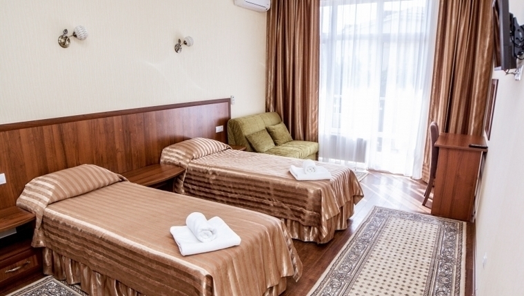 - Для размещения 3 и более человек предоставляется «Стандарт +» 2х-местный. В номере: санузел с душем или ванной, балкон, кровать-трансформер, доп. место - диван, телевизор, холодильник, сплит-система.