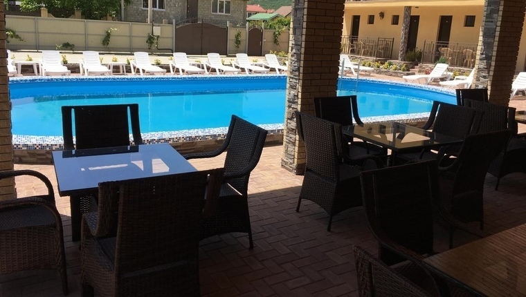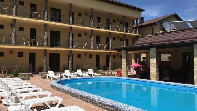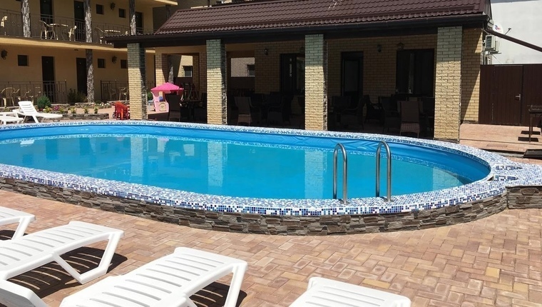 На территории гостевого дома имеется большая дворовая зелёная территория, на которой расположен бассейн (6•12 метров), оборудованный шезлонгами и всем необходимым для комфортабельного отдыха.