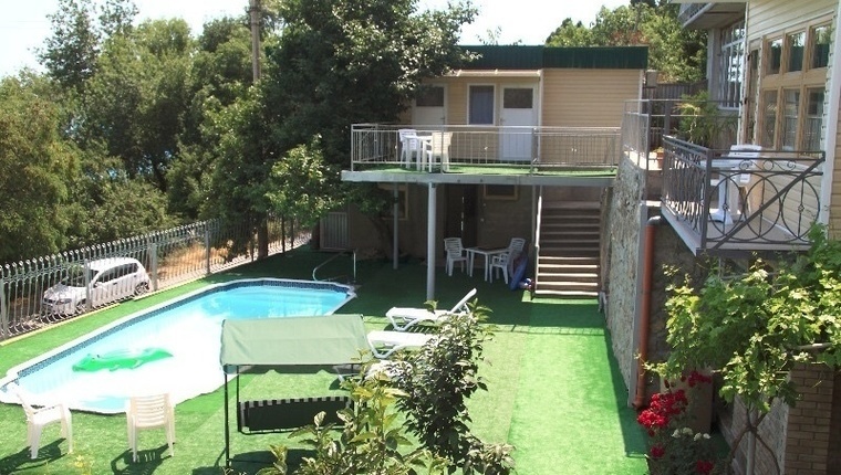 На территории находятся номера для проживания, бассейн 10×4м с шезлонгами, парковка, мангал, места для отдыха.