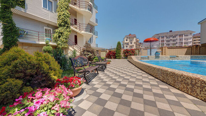 Окна и балконы выходят на бассейн.