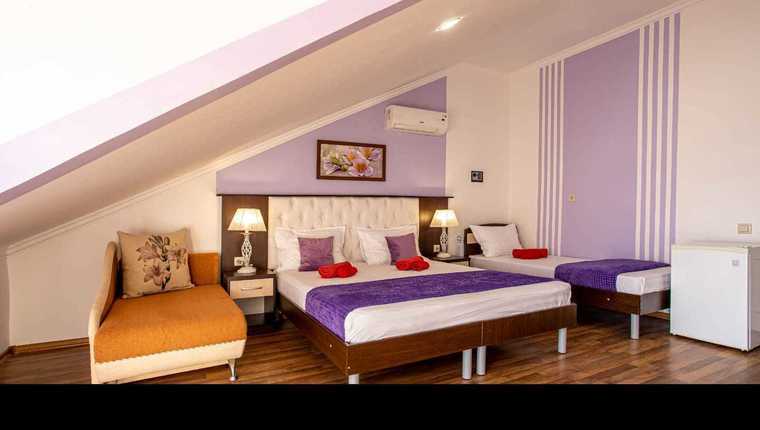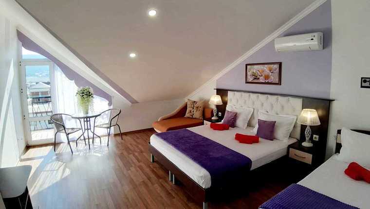 - В каждом номере предусмотрен собственный санузел, где для гостей подготовлены косметические наборы, в комнатах есть кондиционеры и техника: холодильник, телевизор, утюг, шкаф.